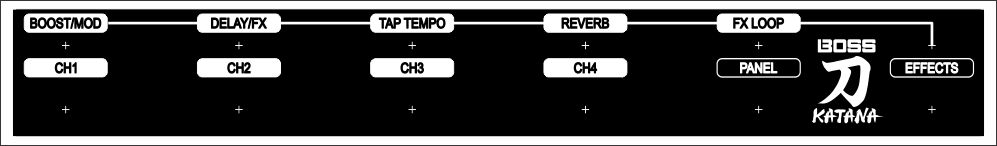 BOSS© KATANA HEAD The BOSS© Katana Head is a 100W Guitar Amp Modeler with 5 channels named brown, lead, crunch, clean and acoustic. 55 BOSS©-quality effects are available to add to the base amp sounds. The Power Amp Section is variable between 0.5, 50 and 100 WATTS and can feed an external 8 Ohm speaker cabinet. The other features are MIDI control, a switchable FX loop and an internal 5 inch speaker for low-volume rehearsal.